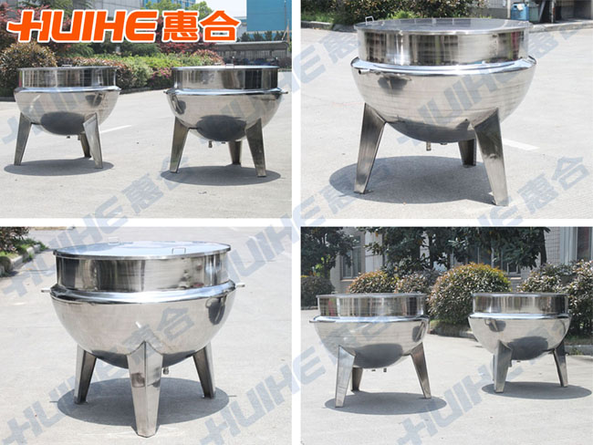 夾層蒸汽鍋由鍋體和可傾架組成;鍋體是由內外球形鍋體組成的雙層結構形式,中間夾層通入蒸汽加熱。